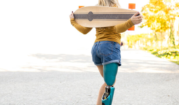 Back view of crop anonymous female skater with bionic prosthesis standing in city with longboard and enjoying summer