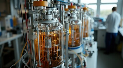 Advanced Laboratory Equipment for Biochemical Research Featuring Glass Reactors with Bright Orange Liquid and Scientist Working in Background