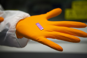 Gloved hands displaying an experimental chip inside a clear package suggesting neuromorphic computing, biosensor research and the next generation of high performance electronic devices.