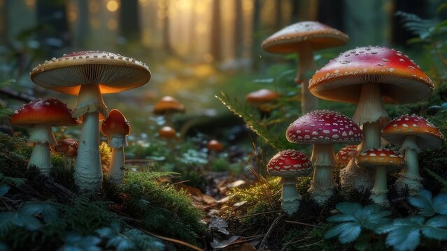 Forest floor mushrooms bathed in morning light
