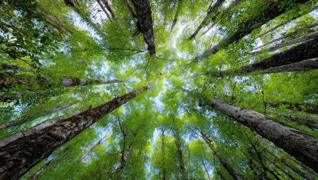 Lush forest canopy viewed from below, showcasing vibrant green foliage.