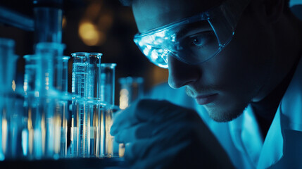 Scientist's gloved hand holds a luminous vaccine vial in a laboratory, symbolizing cutting-edge medical research, drug discovery, health innovation, and biotechnological advancement.