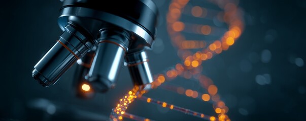 Close up of a microscope with a blurred DNA strand, scientific equipment is focused. Concept for genetic research, pharmaceutical studies and biotechnological innovation