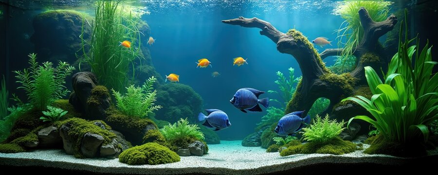 Freshwater aquarium with various tropical fish swimming freely. Blue, orange fish explore rich green water plants, mossy rocks, driftwood. Natural underwater biotope offers relaxing, vibrant view.