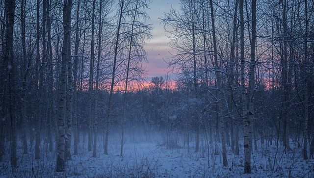 Birch trees standing in misty winter twilight with falling snow and pink horizon