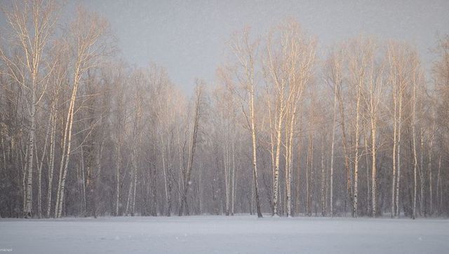 Pale birch grove receiving gentle snowfall in soft winter morning light