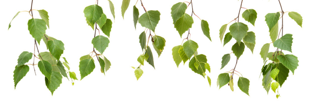 Birch branch with young leaves and catkins isolated on white background