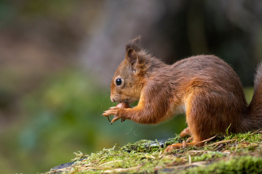 red squirrel, Sciurus vulgaris, close up portrait on moss and forest floor covered in the orange autumn leaves within a pine and birch forest, Scotland.