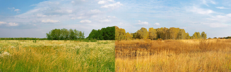 National flag of Ukraine in wheat field with birch trees against blue sky, Ukraine flag double exposure