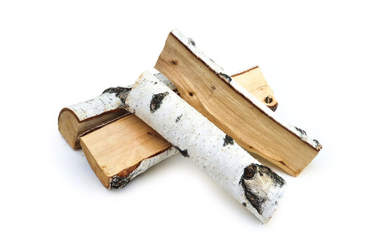 Firewood isolated on white background with clipping path. Wooden birch logs, bonfire. Close-up, front view