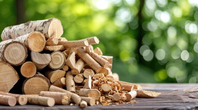 A pile of birch wood logs and kindling sit on a table, ready for a fire