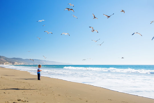 Happy amazed kid running, chasing birds. Kid boy chasing birds near summer sea beach. Happy child playing with seagull birds outside on summer day.