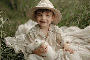A boy with a bird on the grass