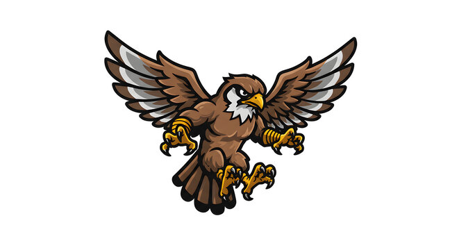 Aggressive flying falcon mascot with outstretched wings and sharp talons, a fierce bird of prey symbol of power and strength, depicted in a dynamic cartoon vector illustration.