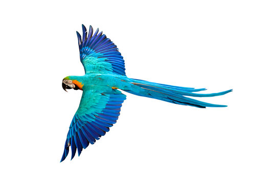 Colorful red bird parrot sitting on wooden bar against blue sky
