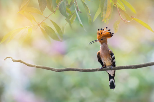Crested bird perching alone.Long bill bird, Eurasian hoopoe ( Upupa epops ) in summer time..