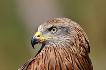 Selective focus shot of a brown red kite bird face with a yellow beak