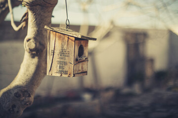 small wooden house of birds in the garden.