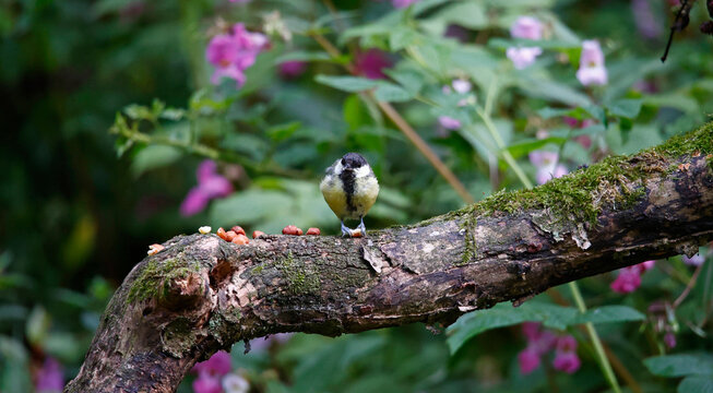 Eurasian penduline tit, remiz pendulinus, sitting on a nest hanging from a tree branch in spring. Little bird building shelter from grass. Animal holding plant in beak.