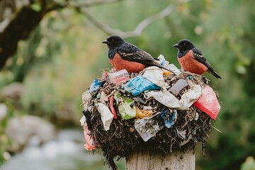 Nestling birds sitting in their nest on blooming tree and waiting for feeding. Young birds with orange beak. Baby birds in spring.
