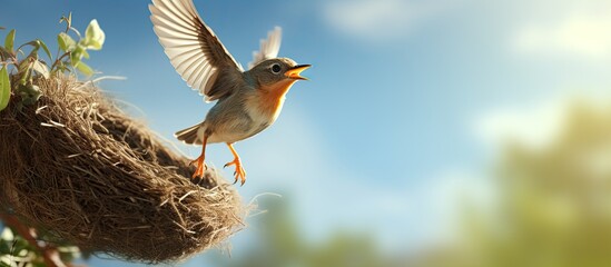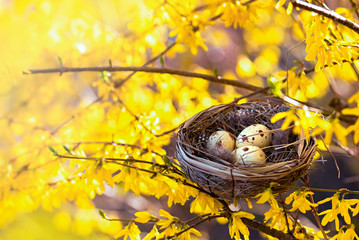 Close up of nest inside green bush.  Bird nesting . Black bird Kos with orange bill sitting on eggs in nest inside green tree. Spring is here. Bird in wildlife. Birds from backyard. Turdus merula