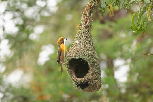 Baya weaver bird building nest on tree branch