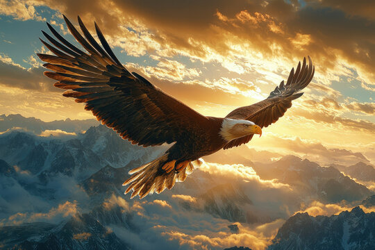 Majestic bald eagle soaring through a breathtaking sunset over snow-capped mountains.