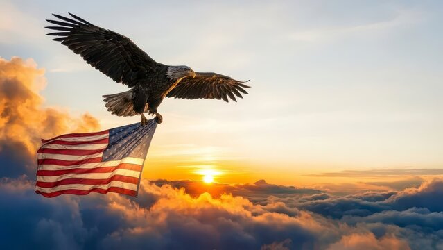 Majestic eagle soaring through the sky with American flag during vibrant sunset over clouds