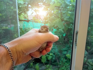A man lets the bird through the window to freedom