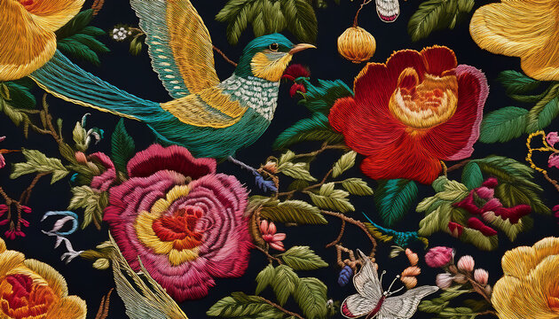 Elegant chinoiserie pattern with vibrant floral and bird motifs