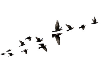 Migratory birds flying in the shape of v on the soft and blur pastel colored sky background. gradient clouds on the beach resort. nature. sunrise.  peaceful morning.Instagram toned style