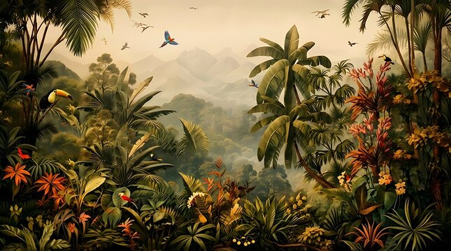 Lush tropical jungle landscape with birds and flowers plants