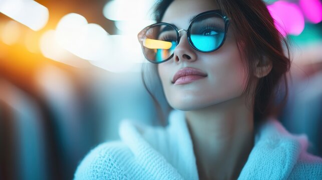 A reflective woman stands with a serene expression, wearing stylish glasses and a cozy sweater under moody lights, representing contemplation and elegance.
