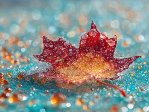 Crimson maple leaf in crystallized sea foam, birefringent light refraction, pearl sand texture, teal ocean bokeh with amber, luxury nature, creative backdrop, advertising concept