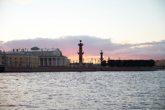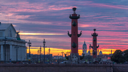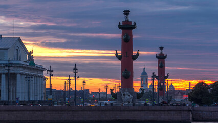 Sunset over Strelka - Spit of Vasilyevsky Island with Rostral Columns timelapse in Saint Petersburg, Russia