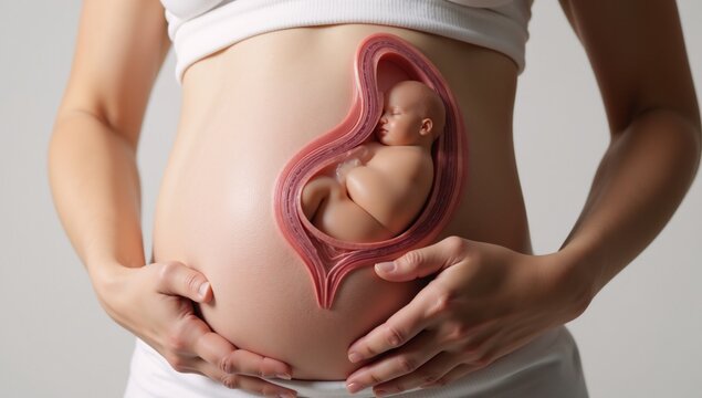 Pregnant womans belly with visible baby in utero Front View