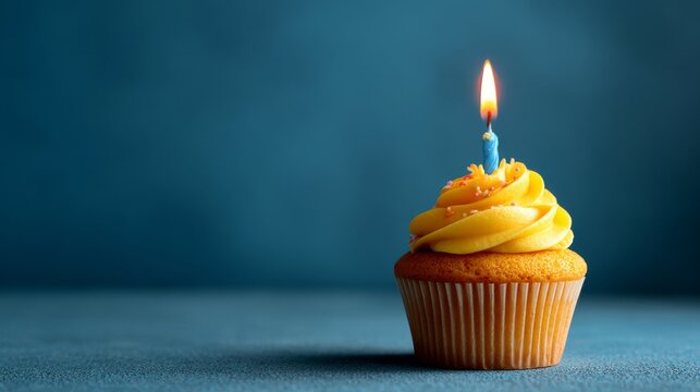 Yellow birthday cupcake with lit candle on blue background for celebration, party decor, festive greeting, anniversary, or special occasion