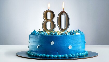 Decorated blue cake for birthday or anniversary party, candle number 80, white background