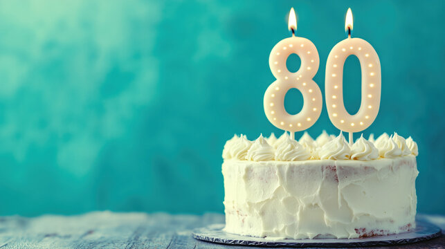 Eightieth birthday cake with cream icing and lit candles in shape of 80 bright background years