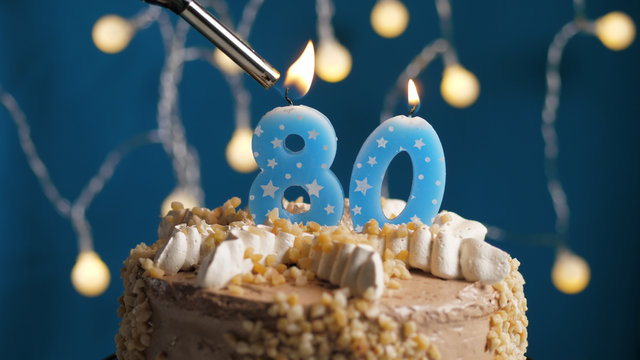 Elegant Eightieth Birthday Cake with Cream Icing and Lit Candles, Bright 80 Years Background