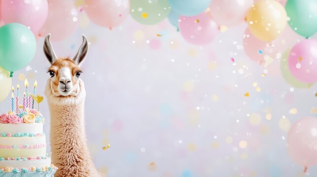 Llama Birthday Celebration: A charming llama poses proudly next to a delicious birthday cake, surrounded by pastel balloons and celebratory confetti.  Perfect for birthday invitations, cards.