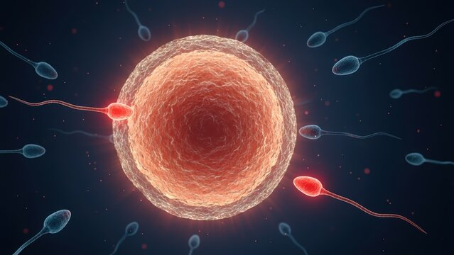 Sperm cells approaching the ovum against a dark background illustrating the process generic fertilization and fertility