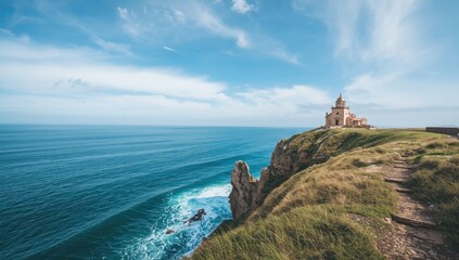 Aerial view of a Ermita de la Regalina on the steep cliffs in Asturias, Spain