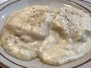 Plate of biscuits and sausage gravy sprinkled with black pepper