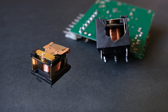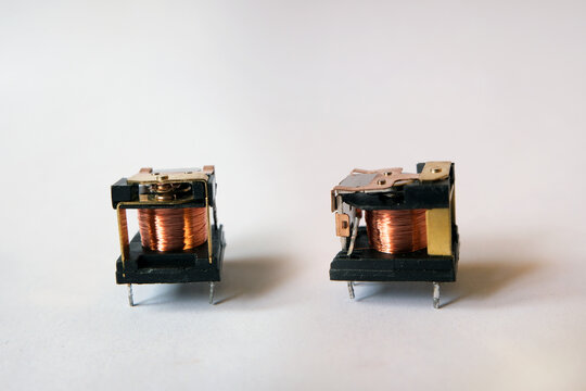 Inside of electromechanical power relays. Relay is an electrically operated switch. Two image merged.
