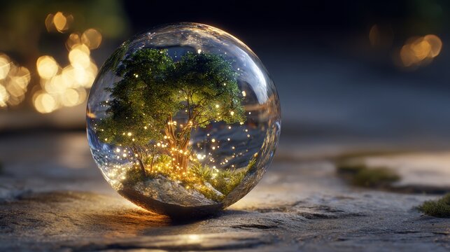 Enchanted tree encased in a magical glass orb with glowing lights