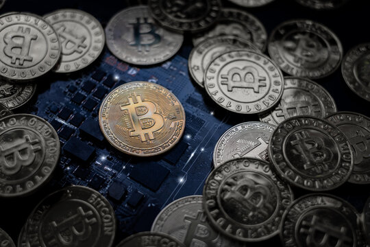 cryptocurrency concept with Golden coins with bitcoin symbol