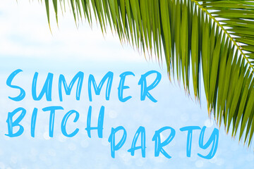 Summer bitch party message written in elegant font on the background with palm leaf and blue sea. Holiday concept and advertising of tour agency.