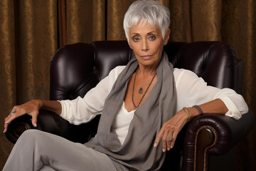 successful wealthy professional older woman in portrait sitting on leather lounge