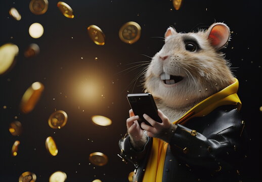 Hamster with a phone. Animal is playing a game on a smartphone. success and crypto exchange. coins and wealth